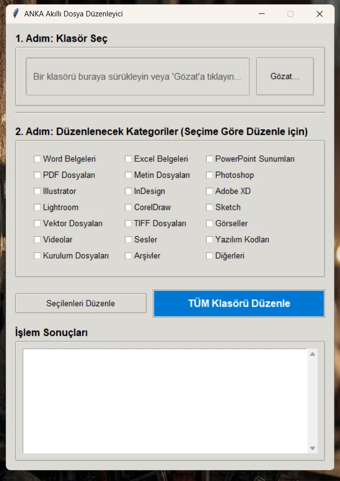 Portfolyomun öne çıkan projelerinden biri olan ANKA Akıllı Dosya Düzenleyici, kullanıcıların karmaşık ve düzensiz klasörlerini saniyeler içinde otomatik olarak organize etmesi için geliştirdiğim bir masaüstü uygulamasıdır. Bu araç, özellikle çok sayıda dosya, evrak ve projeyle uğraşan tasarımcılar, geliştiriciler ve genel kullanıcılar için büyük bir zaman kazandıran pratik bir çözüm sunar.