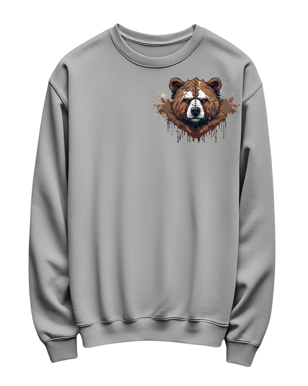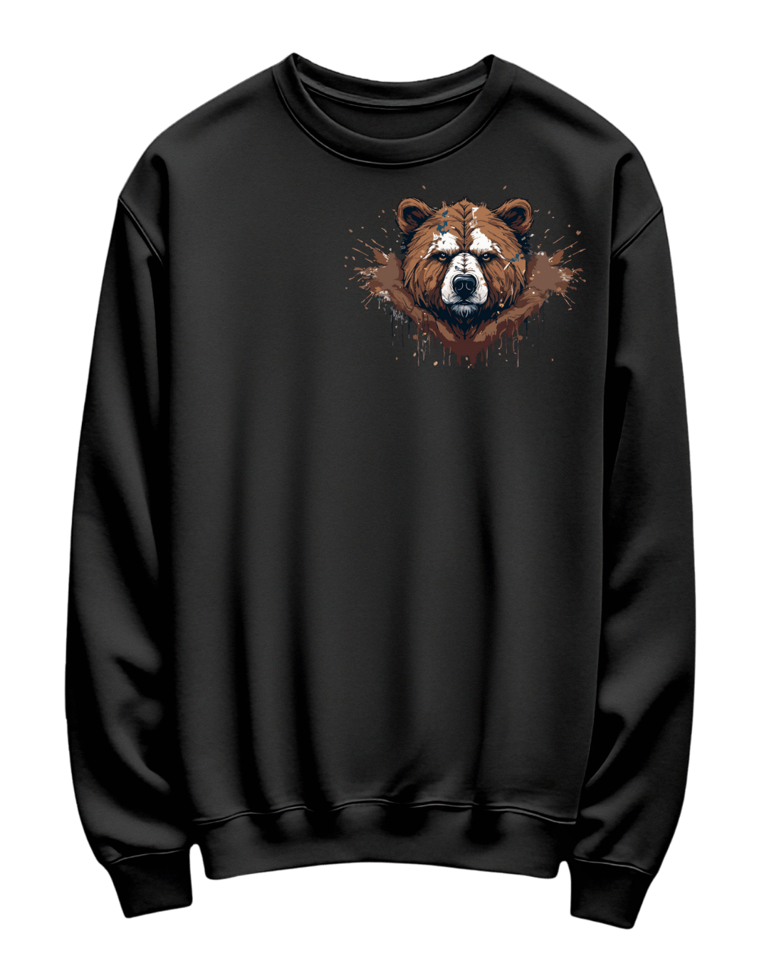 Ön Yüz: Sweatshirt'ün ön yüzünde, sol göğüs hizasında, ayı başının daha küçük ve minimalist bir versiyonu bulunur. Bu yerleşim, tasarıma zarif ve şık bir dokunuş katarken, ayı figürünün detayları ve çevresindeki çamur/toprak sıçrama efektleri, tasarımın sanatsal yönünü ortaya koyar.