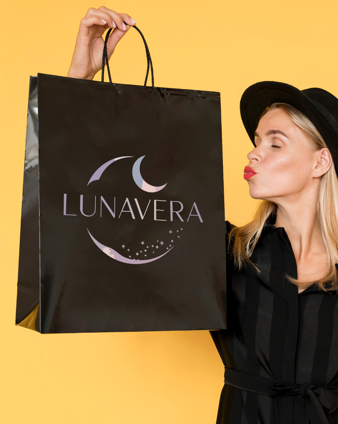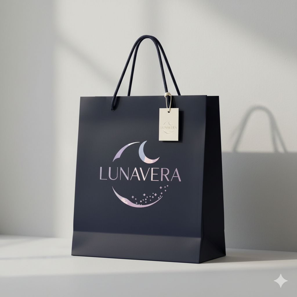 Tasarım, birbirini kucaklayan iki hilal formu üzerine kurulmuştur. Üstteki hilal, gözlemlemeyi ve gökyüzüne ait unsurları; alttaki hilal ise yeryüzünü, düşleri ve yıldızların yaydığı ışıltıyı simgeler. Ortadaki Lunavera yazısı bu iki dünya arasında bir köprü kurar. Hilallerin içinde kullanılan pastel ve yumuşak tonlar (açık mor, pembe, mavi), markanın hassas, zarif ve romantik ruhunu yansıtırken, zemindeki koyu renk ise gizemi ve derinliği vurgular.