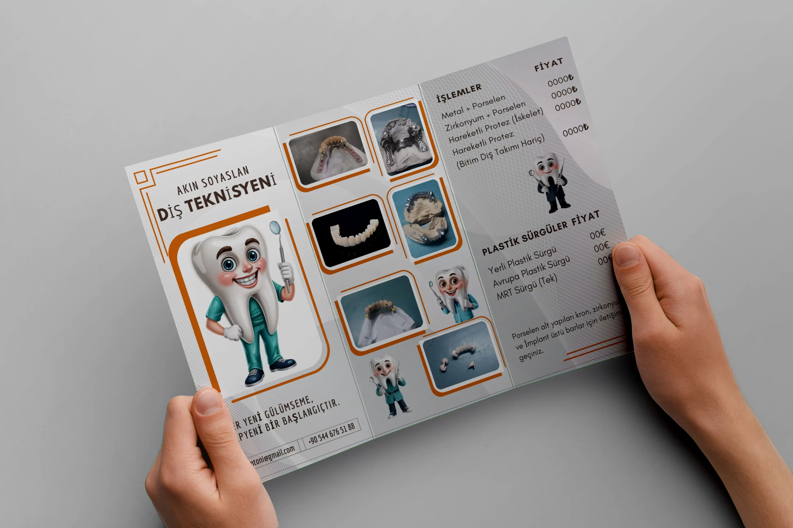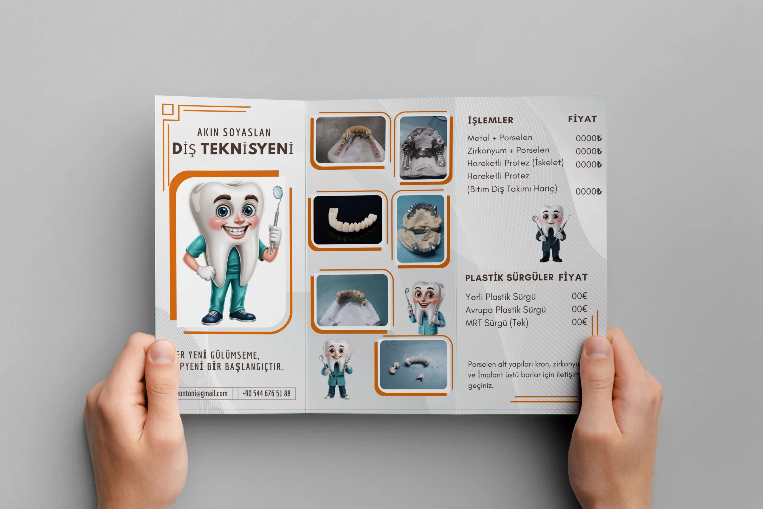 Bu broşür, Akın Soyaslan'ın diş teknisyenliği hizmetlerini ve fiyat listesini profesyonel, anlaşılır ve dikkat çekici bir şekilde sunmak amacıyla tasarlanmıştır.
